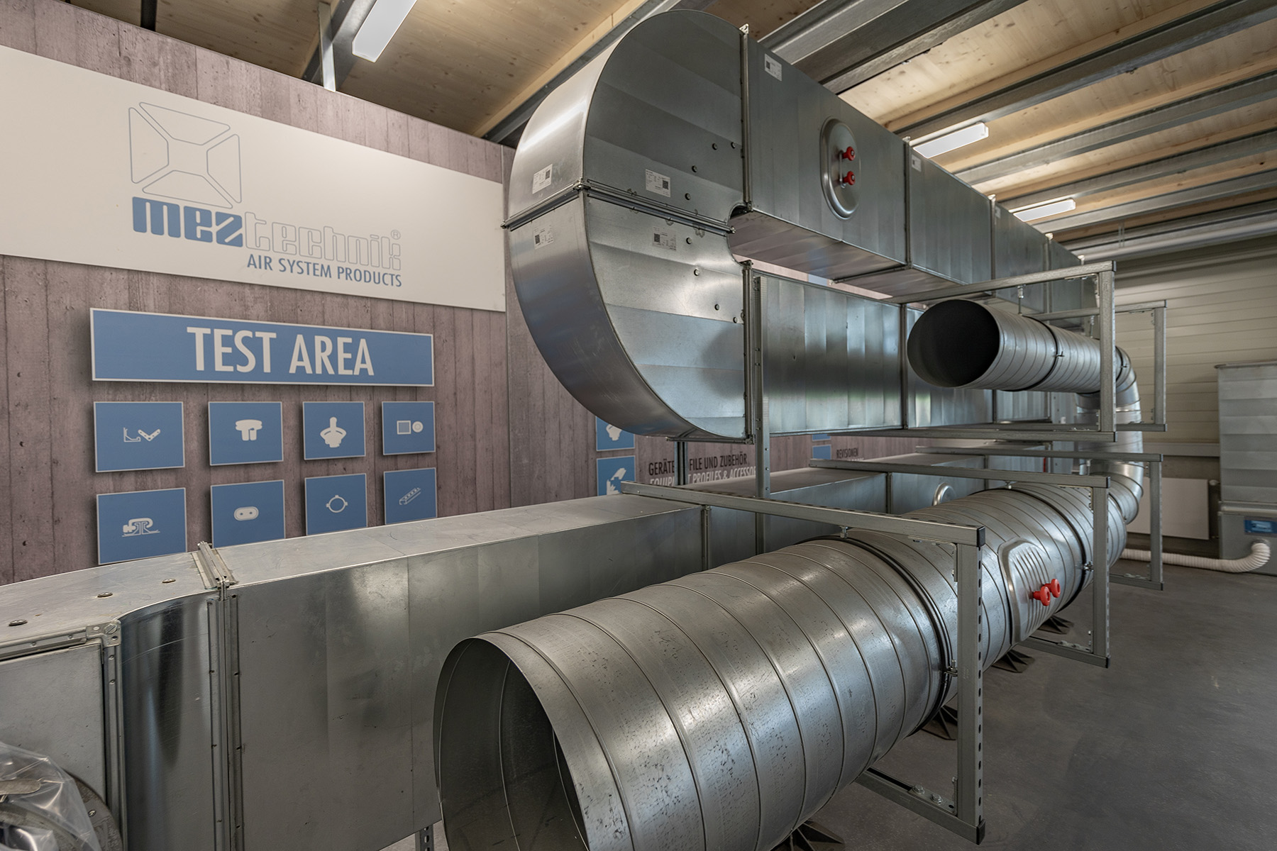 Einer der Hauptbestandteile der DEMO-AREA ist ein Luftkanal mit sowohl runden als auch eckigen Strängen, ergänzt durch Jalousieklappen und weitere technische Elemente. Dank integrierter Revisionsöffnungen kann der Innenbereich des Kanals leicht eingesehen werden. Dies bietet eine realitätsnahe Umgebung für praktische Übungen.